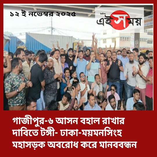 গাজীপুর-৬ আসন বহাল রাখার দাবিতে টঙ্গী- ঢাকা-ময়মনসিংহ মহাসড়ক অবরোধ করে মানববন্ধন