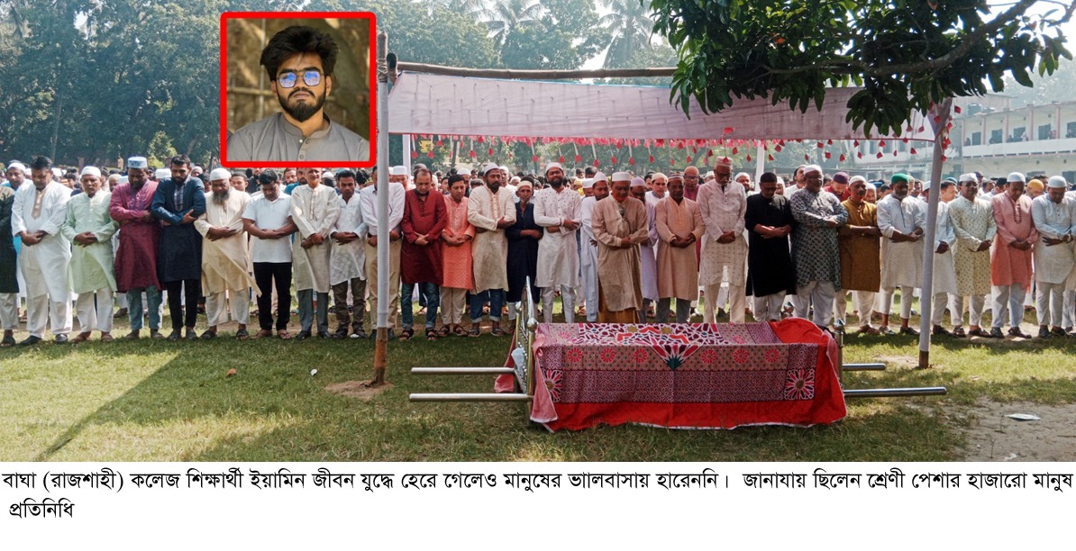 ঢাকার এভারকেয়ার হাসপাতালে চিকিৎসাধীন অবস্থায় সড়ক দুর্ঘটনায় আহত কলেজ শিক্ষার্থী মোস্তাকিন আহমেদ ইয়ামিন (১৭)বুধবার (০৫-১১-২০২৫) রাতে মারা গেছে। বৃহসপতিবার (০৬-১১-২০২৫) শাহদৌলা সরকারি কলেজ মাঠে জানাযার নামাজ শেষে বাঘা কেন্দ্রীয় গোরস্থানে দাফন করা হয়েছে।