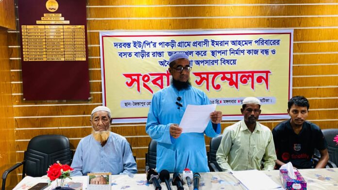 সংবাদ সম্মেলনে আরও বলা হয়, দীর্ঘদিন আইনি প্রক্রিয়া শেষ বিজ্ঞ আদালত জমির মালিকানা ইমরান আহমেদ ও তার পরিবারের পক্ষে রায় দেন। ফলে নজরুল ইসলাম গং নতুন করে জমি দখলের চেষ্টা করছে এবং চলাচলের রাস্তা বন্ধ করে দেওয়ায় পরিবারটি চরম দুর্ভোগে পড়েছে। অবৈধভাবে স্থাপনা নির্মাণের প্রতিবাদ করায় পরিবারের সদস্যদের হুমকি দেওয়া হচ্ছে বলে দাবি করে তিনি বলেন আমরা বর্তমানে নিরাপত্তাহীনতায় রয়েছি।