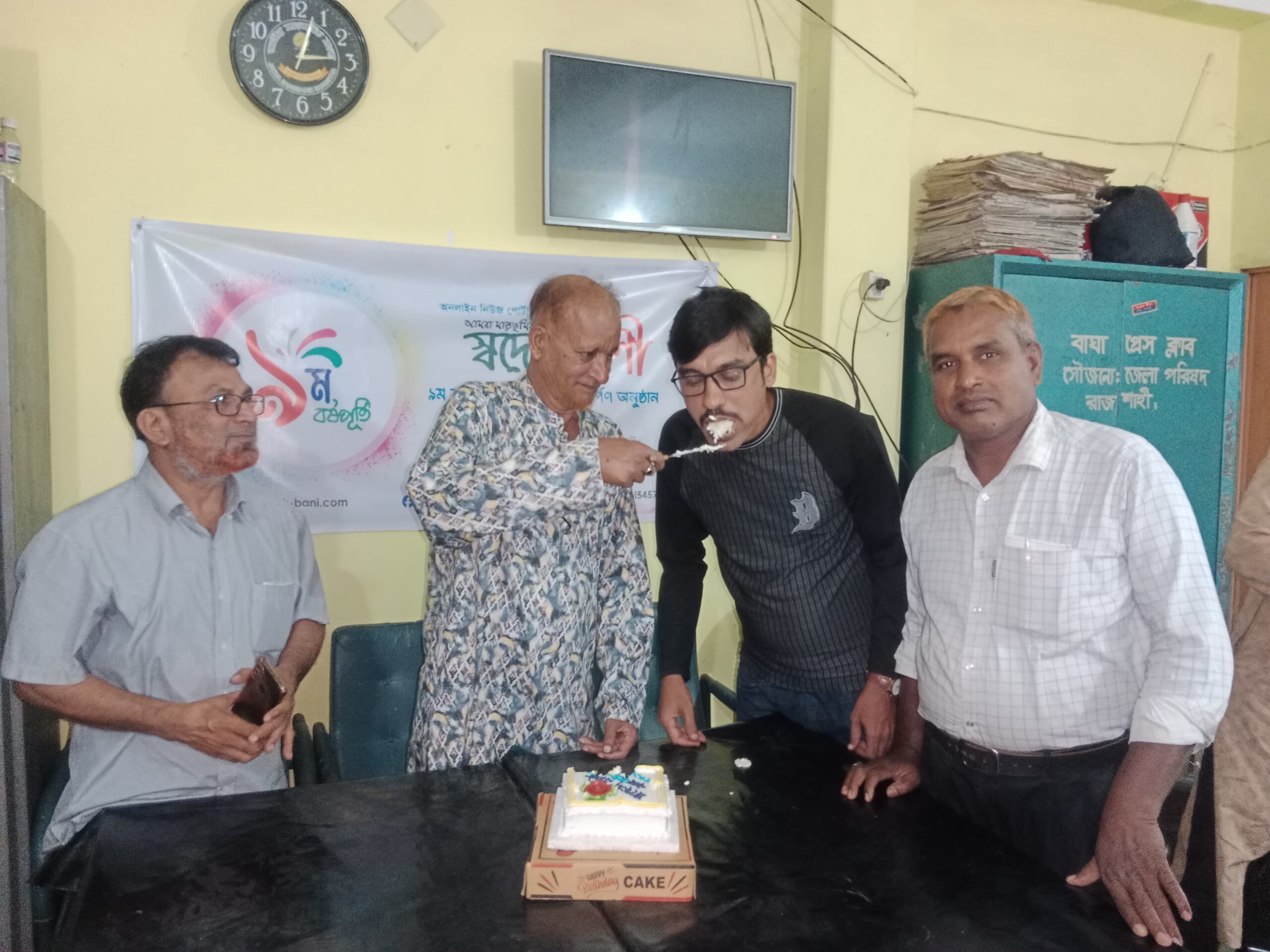 মঙ্গলবার (৪ নভেম্বর) সন্ধ্যা ৬টায় বাঘা প্রেস ক্লাব কার্যালয়ে কেক কাটা,আলোচনা সভার আয়োজনের মধ্য দিয়ে প্রতিষ্ঠাবার্ষিকী পালন করা হয়। সম্মানিত অতিথিরা স্বদেশ বাণী লিখা কেক কাটেন। এতে সভাপতিত্ব করেন স্বদেশ বাণী’র বাঘা প্রতিনিধি আব্দুল হামিদ মিঞা।
