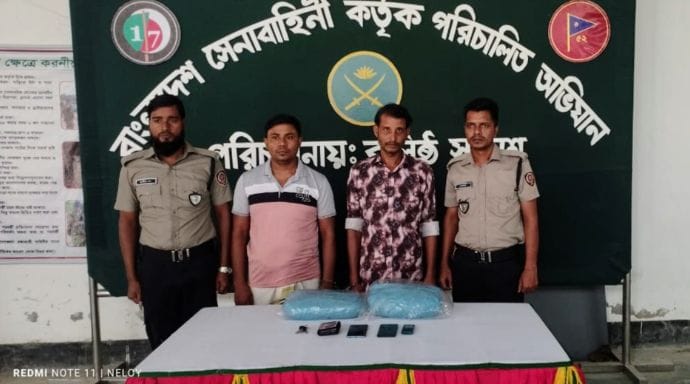 সিলেটের জৈন্তাপুর উপজেলার হরিপুর গ্যাস ফিল্ড এলাকায় সেনাবাহিনীর অভিযানে গাঁজাসহ দুই ব্যক্তিকে আটক করেছে সেনাসদস্যরা।